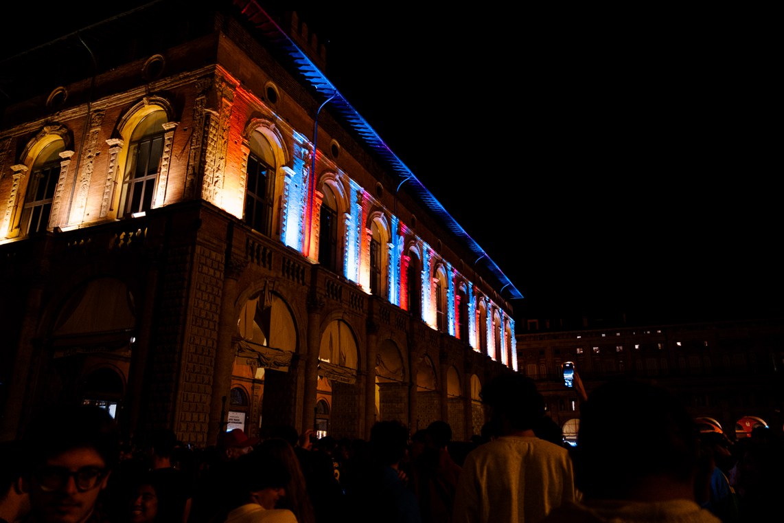 La storica vittoria della coppa Italia infiamma le piazze e i cuori dei tifosi. Sul Crescentone, il nome popolare della centralissima piazza davanti al municipio, tra fumogeni, cori e fontane colorate – ovviamente di rossoblù – le persone si divertono, strette l'una all'altra, esultando, ancora una volta, per il grande Bologna. È una piazza che profuma di vittoria.