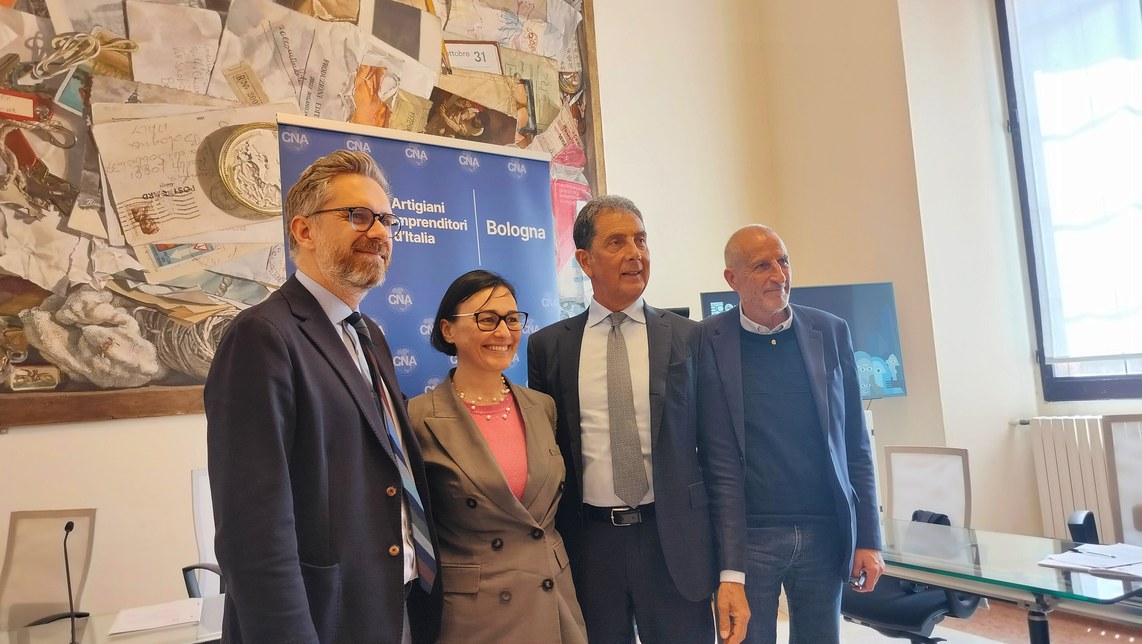 Il sindaco Lepore, l'assessora Guidone, Antonio Gramuglia, presidente Cna Bologna, e Claudio Pazzaglia direttore Cna Bologna (foto di Michelangelo Ballardini)