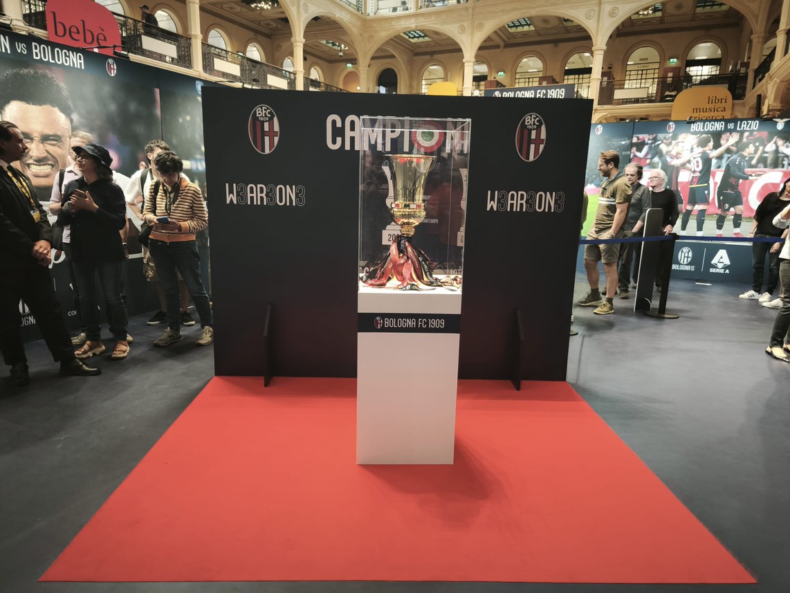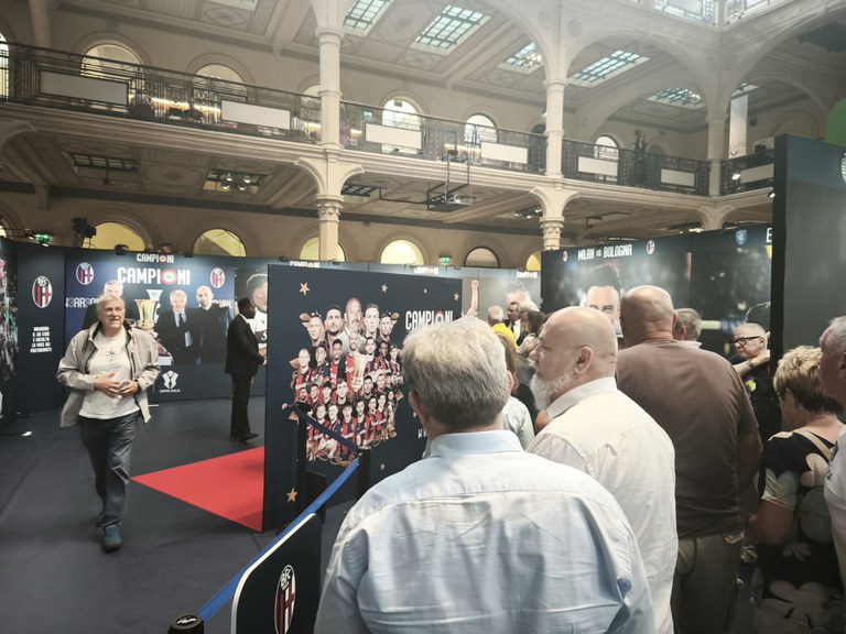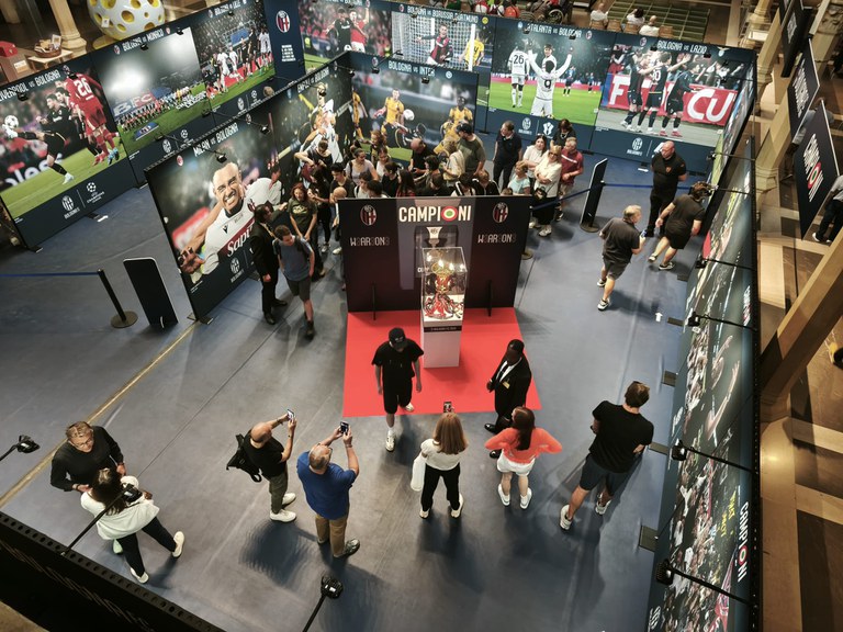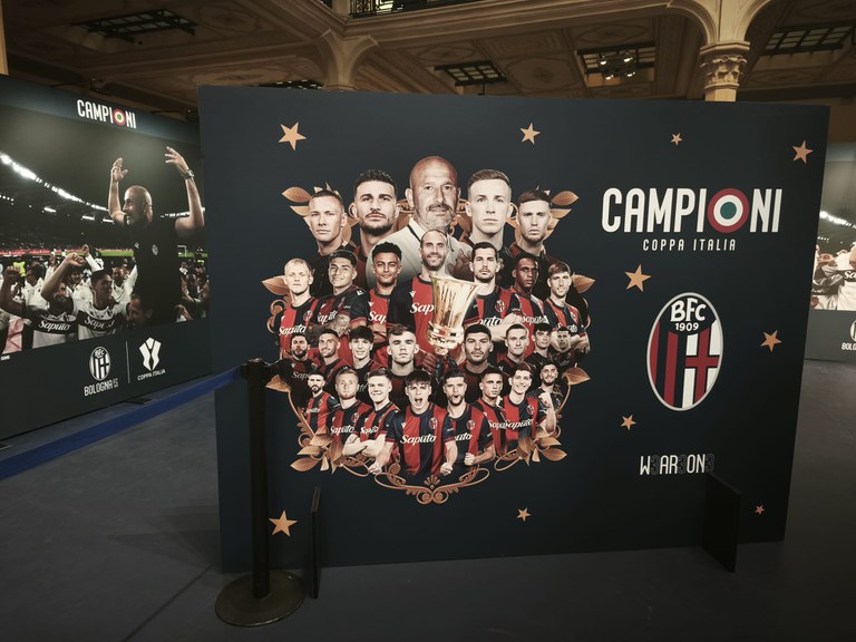 Sotto le volte liberty della Salaborsa la squadra di Italiano abbraccia idealmente i tifosi dopo la vittoria della Coppa Italia. Il trofeo scende in piazza, letteralmente. Si mostra alla città e la città risponde: la coda di tifosi che fin dall’apertura della mostra fotografica “Campioni. Bologna ha vinto” si incontra all’ingresso dell’atrio principale è un’istantanea dell’entusiasmo anche a due settimane dalla finale di Roma. L’amore in Piazza Grande, direbbe qualcuno.
