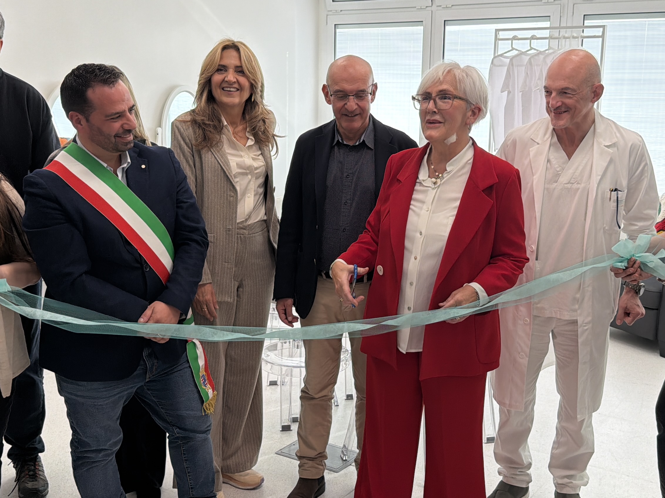 Il taglio del nastro. Al centro l'assessore alla sanità Massimo Fabi, a destra la presidente di Loto Sandra Balboni, a sinistra il Direttore Generale del IRCSS Sant'Orsola Chiara Gibertoni