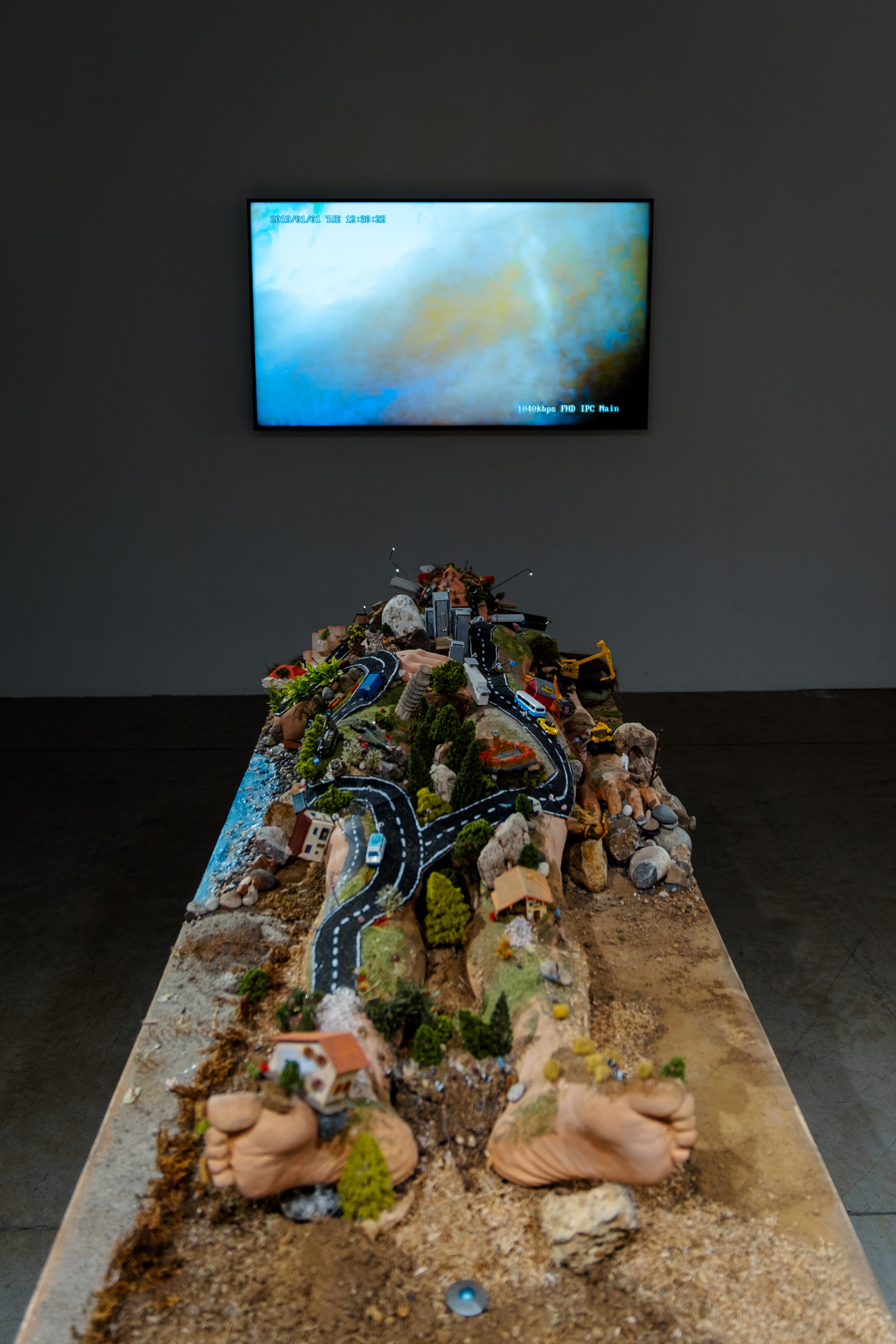 L'altro lato dell'opera Faccio un giro e torno, sullo sfondo un frame del video in cui una macchinina percorre il corpo