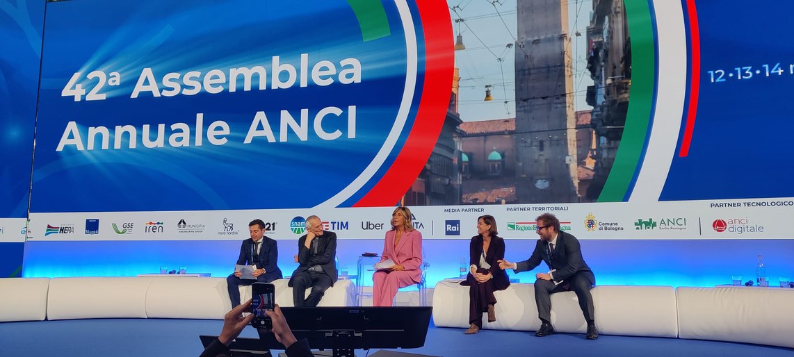 Il cardinale Matteo Zuppi, alla destra della giornalista Myrta Merlino, sul palco dell'Anci (foto Alessandro Fratini)