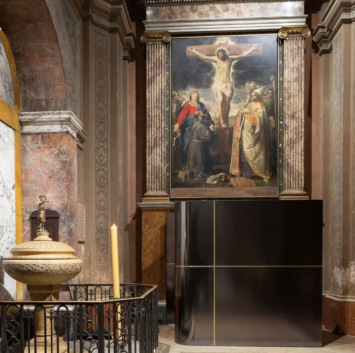 Nella chiesa di Santa Maria della Carità, in via San Felice, nell’ultimo mese c’è una novità. Un parallelepipedo nero, lucido, imponente, ai piedi dell’opera di Annibale Carracci “Crocifissione e santi” del 1583. È il nuovo confessionale insonorizzato, riscaldato e ventilato in cui il prete don Davide Baraldi ascolterà i peccati dei suoi parrocchiani. I molteplici significati associati da Baraldi alla nuova installazione, la superfice lucida per riflettere sé stessi, la geometria che vuole ricordare il movimento dell’abbraccio, l’assenza di un tetto per permettere allo sguardo che si alza di chi è seduto all’interno di incrociare quello del Cristo in croce di Carracci, non hanno però convinto i detrattori. In prima fila il Comitato per Bologna storica e artistica, che in una comunicazione sul proprio profilo Facebook ha parlato di “sinistro squallore” e ha auspicato che venga ristabilito il necessario rispetto culturale per il quadro di Carracci, a loro dire oscurato dal confessionale, arrivando anche a richiedere la rimozione coatta del “lugubre catafalco”.