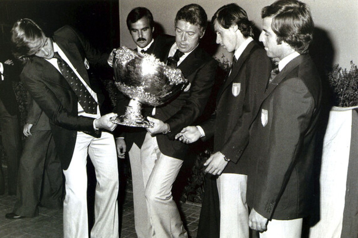 Uno scatto di Nicola Pietrangeli mentre solleva la Coppa Davis con gli azzurri (foto Ansa)
