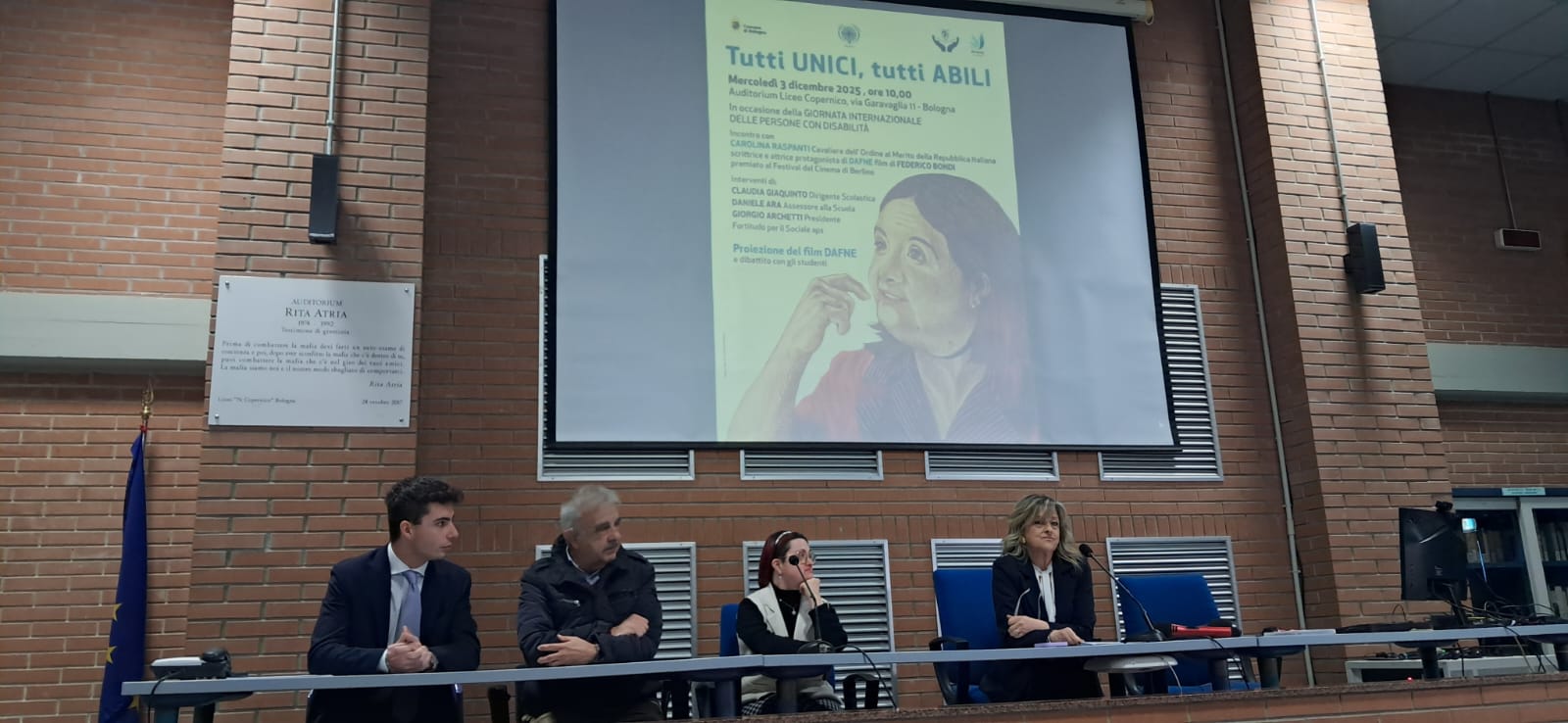 «Alle nuove generazioni dico di non fermarsi mai alla superficie, ma di andare oltre. Non mollate mai, andate avanti con decisione e testardaggine, senza eccedere, ma cercando sempre di farvi valere». L’attrice Carolina Raspanti, portatrice della sindrome di Down e protagonista del film "Dafne" - che racconta la storia di una ragazza con la stessa sindrome - è intervenuta personalmente con queste parole al liceo scientifico “Nicolò Copernico” di Bologna, in occasione della Giornata internazionale delle persone con disabilità. Presentando il film ha scelto di rivolgere agli studenti un messaggio diretto, per dire di avere fiducia nel futuro e voglia di farcela