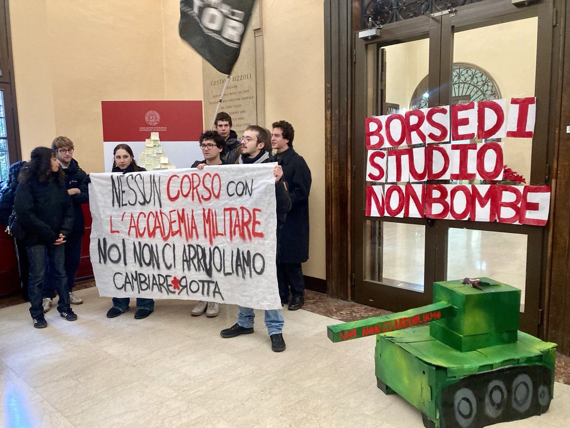 Al centro della contestazione il corso di laurea in Filosofia negato agli allievi dell’Accademia militare di Modena, per il quale erano già scoppiate polemiche nelle ultime settimane tra l'Università di Bologna e il capo di Stato Maggiore dell'Esercito, Carmine Masiello. Il movimento studentesco “Azione Universitaria”, della galassia di Fratelli d'Italia, ha presentato infatti un’interrogazione al Senato, in cui puntava il dito contro i centri sociali che terrebbero «in ostaggio interi dipartimenti, imponendo la loro ideologia». Gli studenti di “Cambiare Rotta” hanno rilanciato l’accusa e rifiutato «i tentativi di porsi a difesa di questi processi, perché non esiste una pluralità di idee nella guerra. I fascisti di “Azione Universitaria” – è la stoccata del collettivo – ancora una volta si pongono come quinta colonna del governo Meloni e dello Stato, difendendo la militarizzazione dell’Università». Dopo aver spiegato le motivazioni del presidio – il rifiuto della guerra negli spazi di formazione, la copertura della totalità delle borse di studio – gli studenti hanno fatto irruzione nel rettorato, appendendo i cartelli di protesta sotto le porte delle aule in cui si è riunito il Senato.