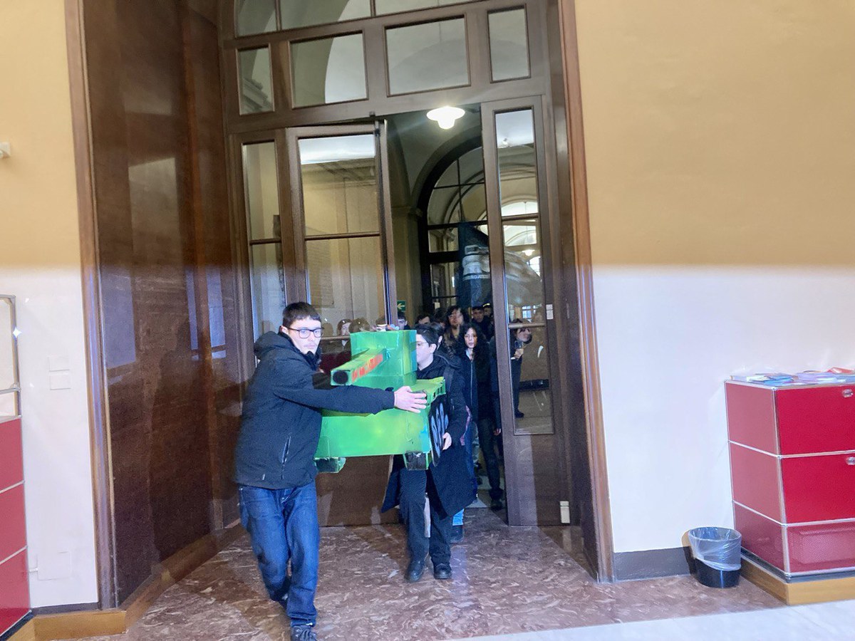 Un piccolo carro armato di cartone, a bordo la ministra dell’Università Anna Maria Bernini, con l'elmetto in testa. Sullo sfondo, i cartelli con la scritta «Borse di studio, non bombe». Mentre al 33 di via Zamboni si riuniva il Senato accademico di UniBo, gli studenti del collettivo “Cambiare Rotta” si radunavano fuori dal rettorato al grido di «Noi non ci arruoliamo! Gli elmetti non li mettiamo!». La protesta mentre ancora non era uscita la notizia che il corso di Filosofia per gli allievi dell'Accademia militare di Modnea sarebbe stato fatto da UniMoRe.