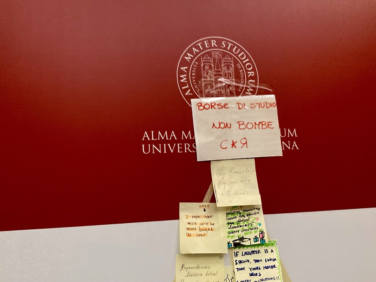 Da oggi, l’albero di Natale fatto di post-it in via Zamboni 33 ha una nuova stella, un appunto con l'auspicio per il nuovo anno, firmato “Cambiare Rotta”: «Borse di studio e non bombe».