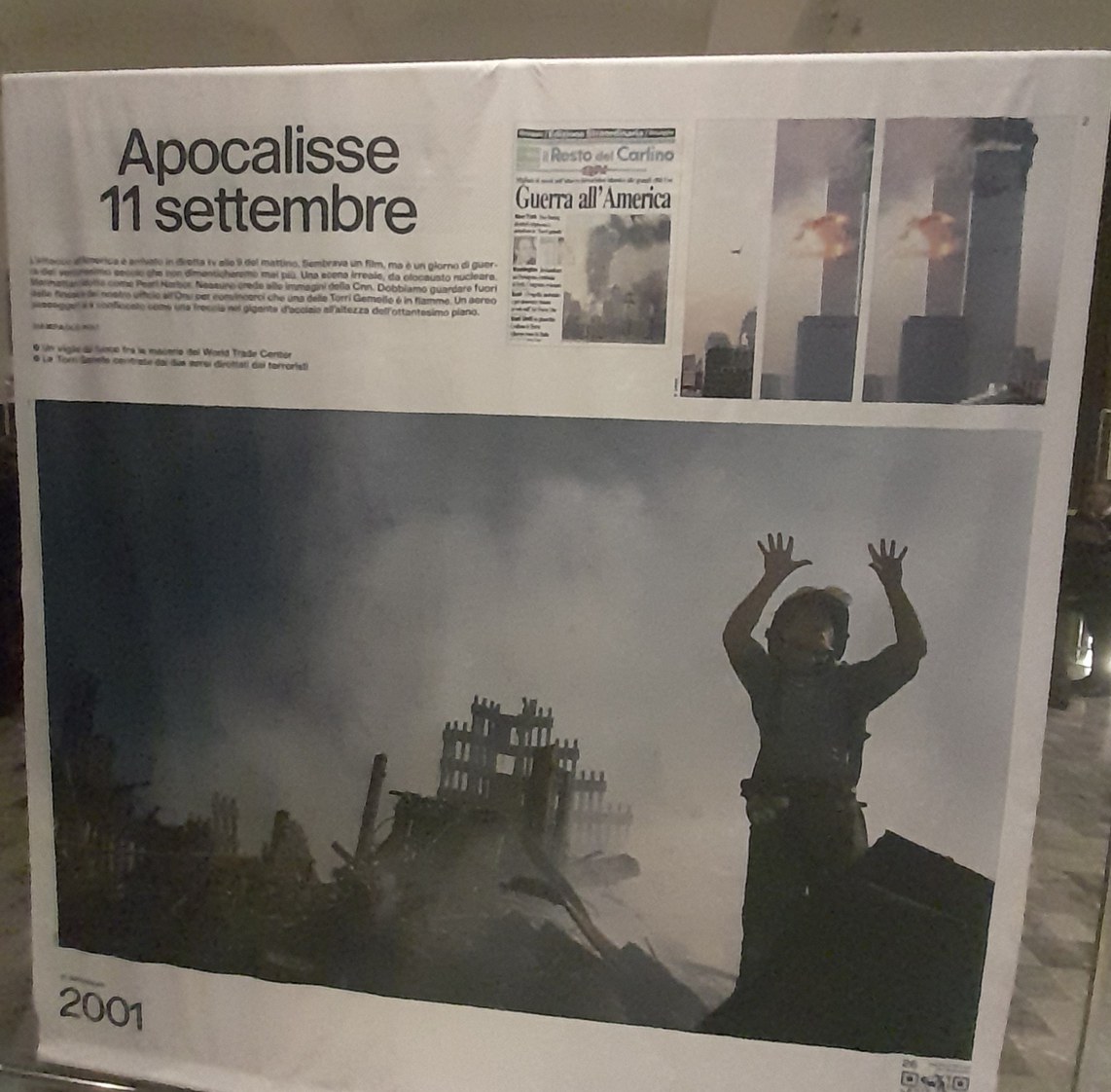 Uno dei pannelli della rassegna, inerente all'attacco terroristico alle Torri Gemelle dell'11 settembre 2001 (foto di Edoardo Cassanelli)