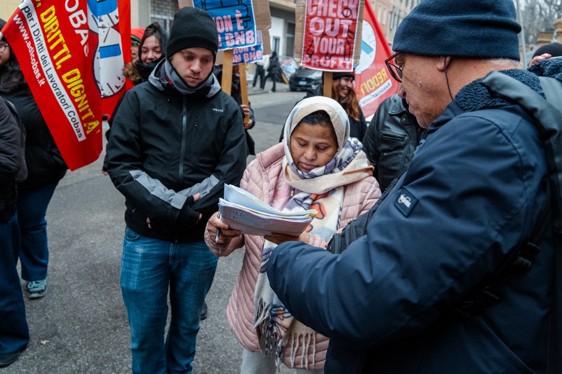 Già dalle prime luci dell'alba, alcune decine di attivisti di Adl Cobas, Labas e Laboratorio di salute popolare si sono radunati di fronte al palazzo dando vita a un picchetto solidale per impedire l’accesso forzato e risolutivo già lo scorso 20 novembre, alle forze dell'ordine e all'ufficiale giudiziario. Attiviste e attivisti hanno presidiato l'ingresso fino al suo arrivo, esponendo striscioni contro l'emergenza abitativa in città con scritte come "questa città non è un B&B" e "check-out your profit", materassi-barricata e l’immancabile tè caldo di Helena Kamal.