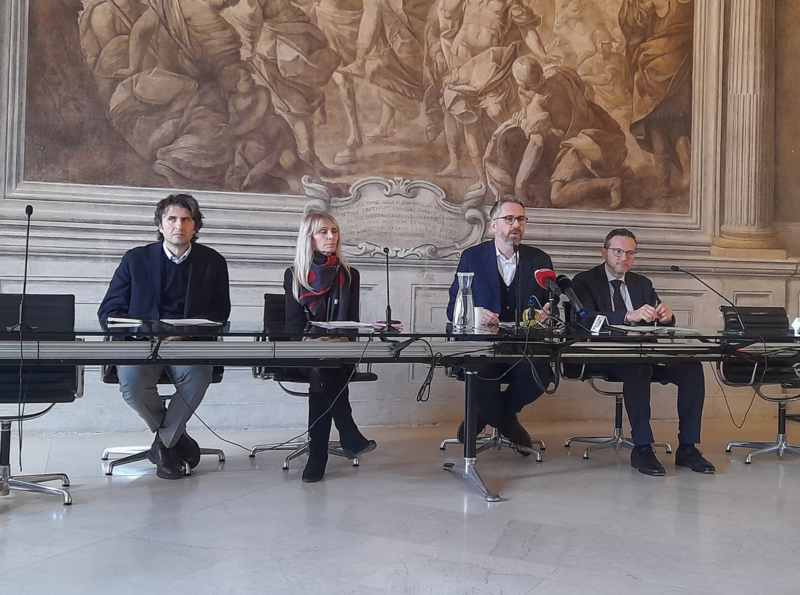 Il sindaco Matteo Lepore (il terzo da sinistra) durante la conferenza sulla questione di Città 30 e sulla fase due del provvedimento (foto di Edoardo Cassanelli)
