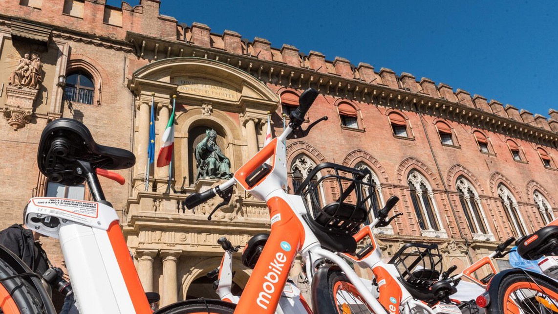 Un'immagine di biciclette sotto Palazzo d'Accursio (foto Ansa)