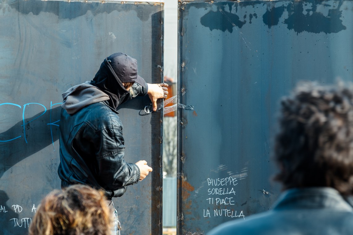 Il cancello del cantiere del Museo dei bambini "sigillato" da un attivista del collettivo "MuBasta" (foto di Alberto Biondi)