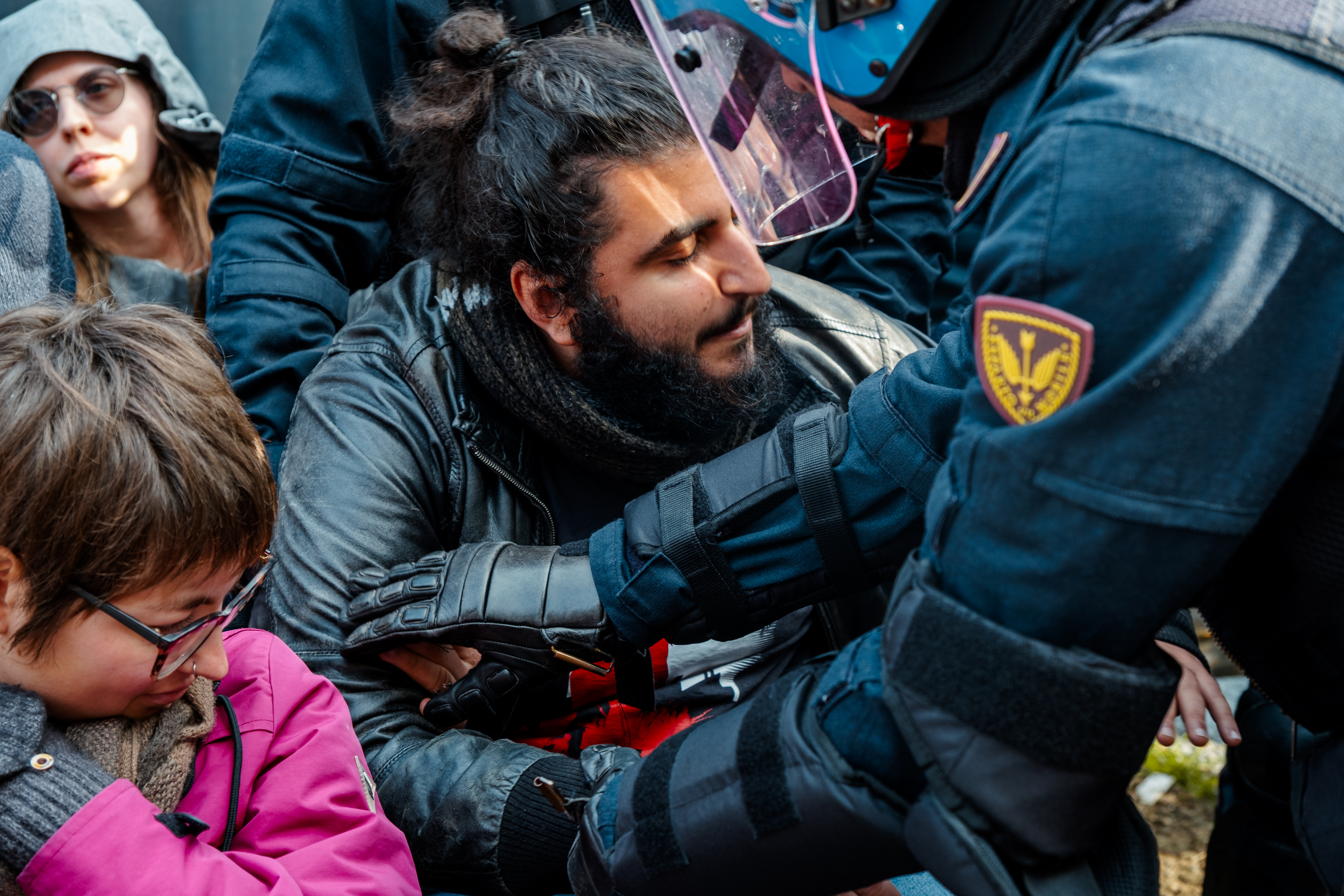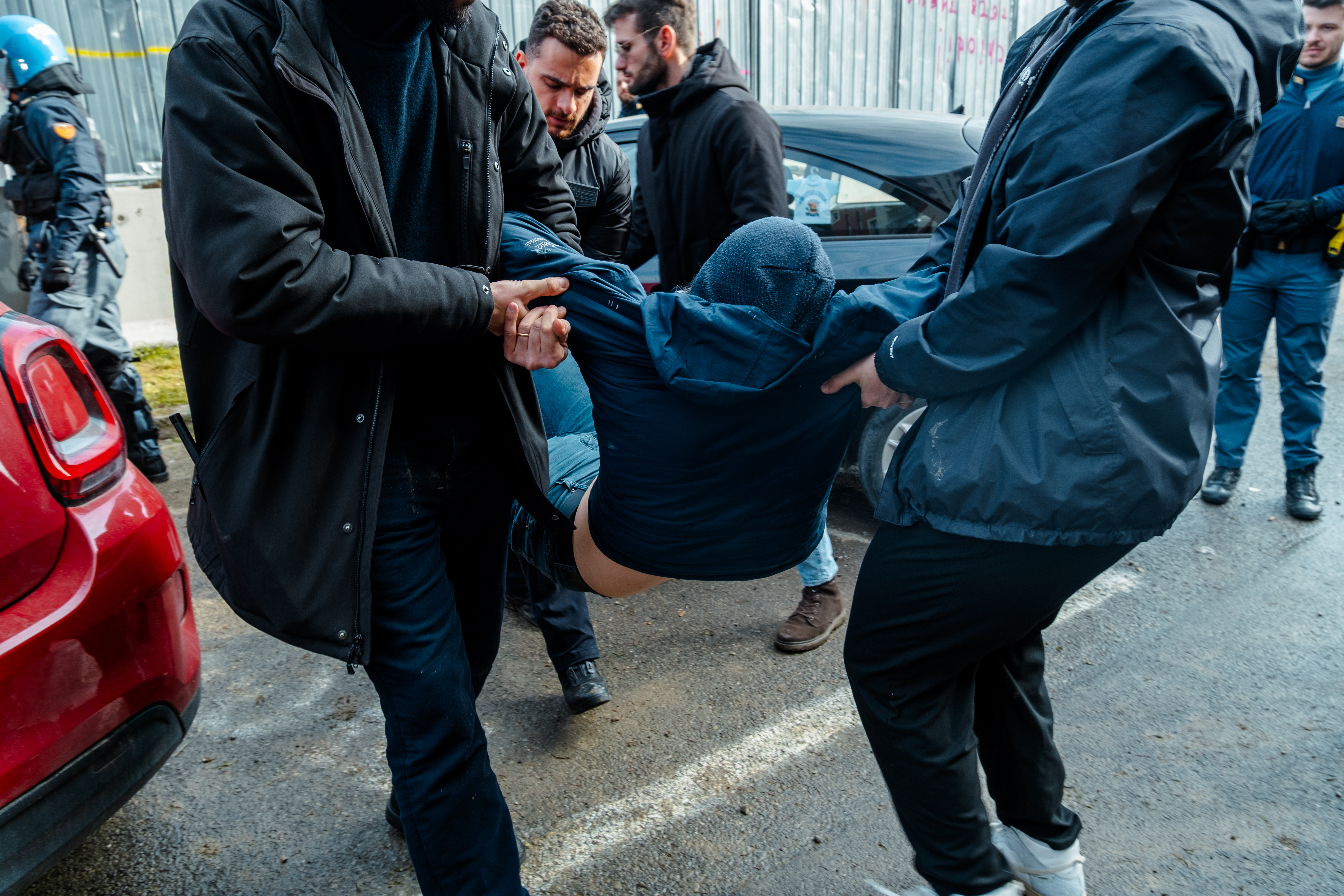 Un manifestante viene allontanato dal presidio (foto di Alberto Biondi)