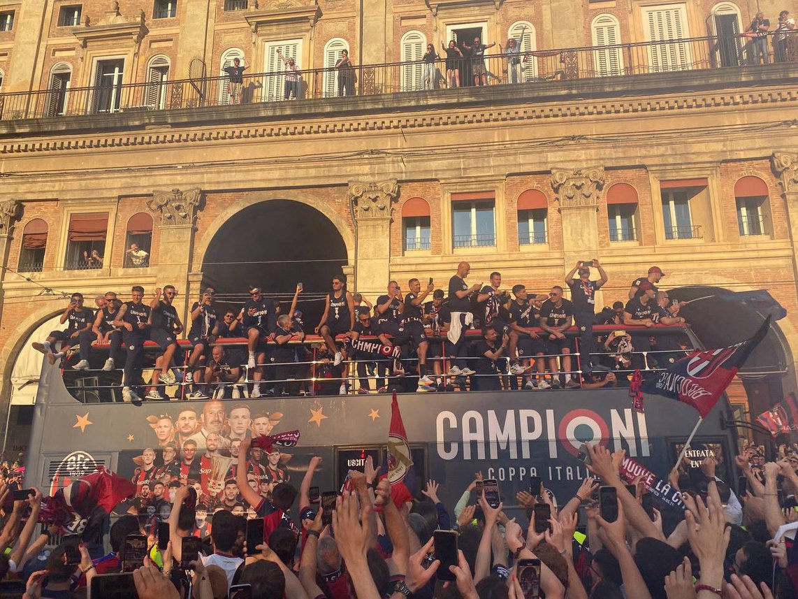 La sera di mercoledì 14 maggio, a Bologna e a Roma, i tifosi hanno scatenato la loro contentezza con cori e fuochi d’artificio, riempiendo il cielo nero di festa e colore. Piazza Maggiore era gremita di gente, batteva un unico grande cuore cittadino. Un momento di soddisfazione oscurato pochi giorni dopo – per la precisione, domenica 18 maggio – dal match contro la Fiorentina, conclusasi 3-2, togliendo la possibilità ai rossoblù di giocare in Champions. Ma l’entusiasmo dei calciatori non è stato scalfito; l’essersi intascati la coppa ha permesso loro di potersi aggiudicare automaticamente il posto nell’“Europa League”.