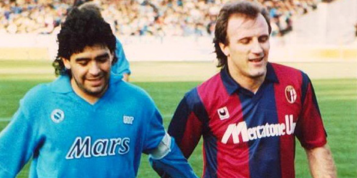 Renato Villa in una foto d’epoca accanto al Pibe de Oro, Diego Armando Maradona (foto presa dal sito del Bologna Calcio)