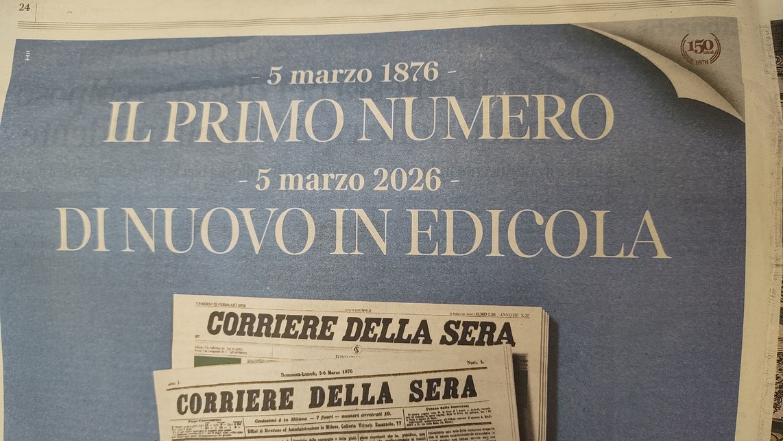 Accanto alla musica, domani prendono il via le pubblicazioni speciali con una sovracopertina del quotidiano che riprodurrà il primo numero del 1876, con il celebre articolo di fondo dello storico fondatore Eugenio Torelli Viollier. L’iniziativa proseguirà dal 12 marzo fino al 31 dicembre con una miniserie da otto uscite che raccoglierà le copie anastatiche delle prime pagine del quotidiano che hanno narrato gli eventi centrali della storia, dalle guerre mondiali alla pandemia Covid toccando sia i grandi delitti italiani, come l’omicidio di Aldo Moro, che i grandi momenti sportivi, come il mondiale del 1982. Anche “7”, il settimanale del "Corriere", verrà investito dalle celebrazioni con un numero speciale dedicato alle grandi penne del quotidiano, da Grazia Deledda a Pier Paolo Pasolini. Il "Corriere" invaderà anche le librerie con un volume che racconta dell’inestricabile legame tra il giornale e la storia dell’Italia: "1876–2026, La storia nelle prime pagine del Corriere della Sera", con la prefazione del direttore Fontana, è un viaggio narrativo che va dalla morte di Giuseppe Verdi alle leggi razziali fino agli eventi più recenti.